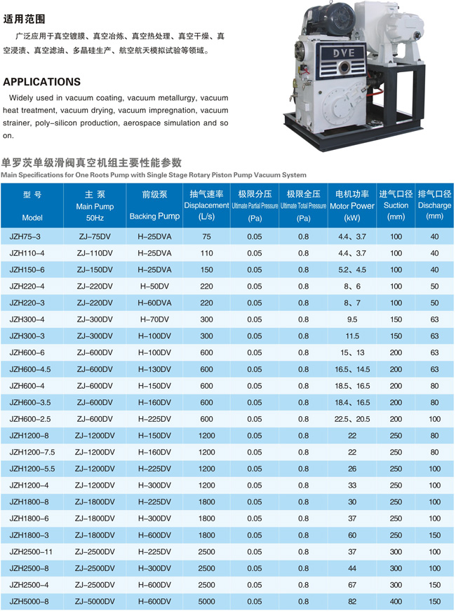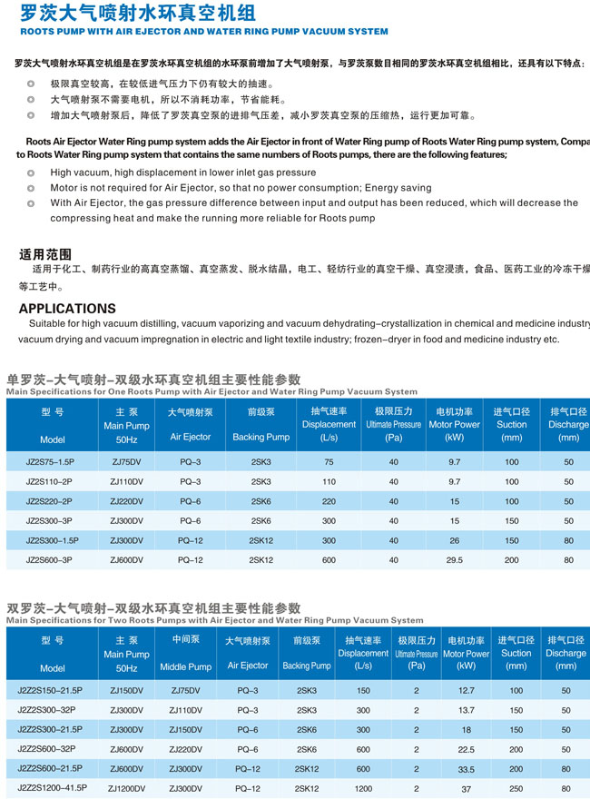 此機(jī)組主要用于需要處理大量水蒸汽,且極限真空度要求較高的抽真空系統(tǒng),例如在真空干燥方面。要求處理大量水蒸汽的真空系統(tǒng)中,使用水環(huán)泵是較合適的,但由于其極限真空度不高,致使整個(gè)機(jī)組的極限真空度較低。雖然在要求真空度較高的抽真空系統(tǒng)中,需要極限真空較高的機(jī)械真空泵作為前級泵使用。但由于水環(huán)泵的耗電量大,效率很低,噪聲高,在需要長時(shí)間的真空干燥系統(tǒng)中,用水環(huán)泵作為羅茨泵前級泵很不經(jīng)濟(jì)。